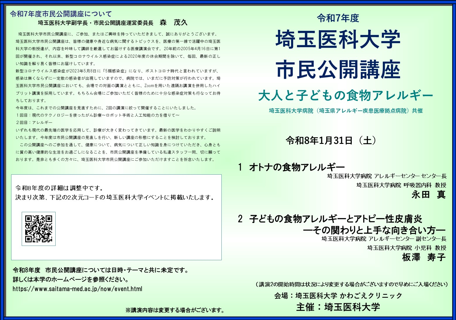 埼玉医科大学市民公開講座は、年2回開催している市民の皆さま向けの講座です。令和8年1月31日、埼玉医科大学病院(埼玉県アレルギー疾患医療拠点病院)との共催により、近年増加傾向にある食物アレルギーについて、「大人と子どもの食物アレルギー」をテーマとして、成人と小児それぞれの特徴を踏まえながらお話しさせていただきました。